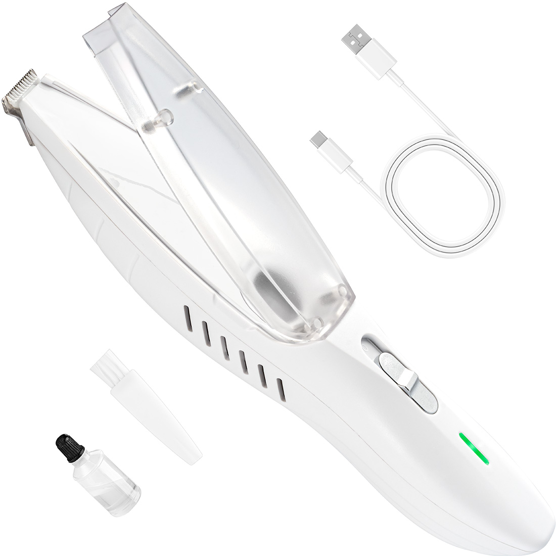 Ten bezprzewodowy trymer z wbudowanym odkurzaczem to praktyczne narzędzie do precyzyjnej pielęgnacji łap, pyska, uszu i innych delikatnych miejsc u zwierząt domowych.